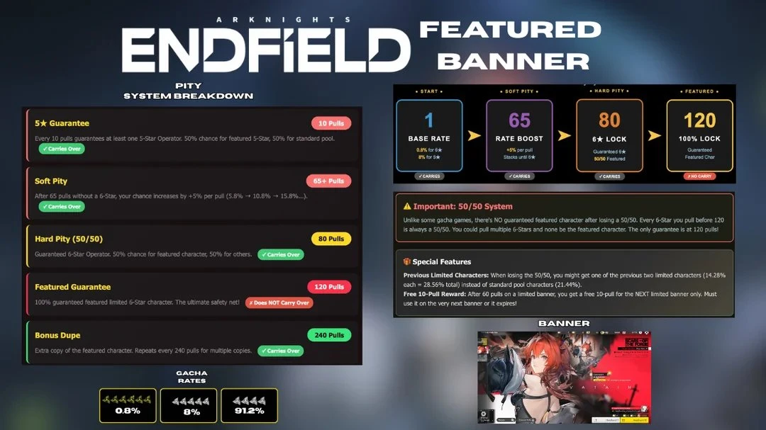 - Каждые 10 круток игрок получает как минимум одного 5-звёздочного оперативника. 50% шанс выбить 5-звёзд с повышенным шансом и 50% выбить 5-звёзд из стандартного пула. Переносится на следующие баннеры.