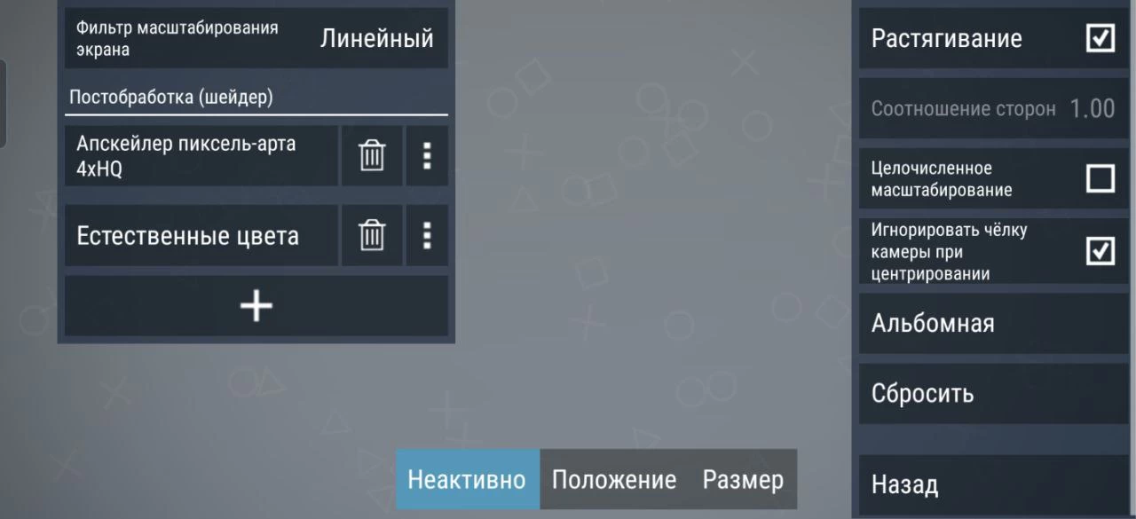 В расположении экрана и эффектов используйте растягивание и два эффекта: апскейлер пиксель-арта 4xHQ и естественные цвета.