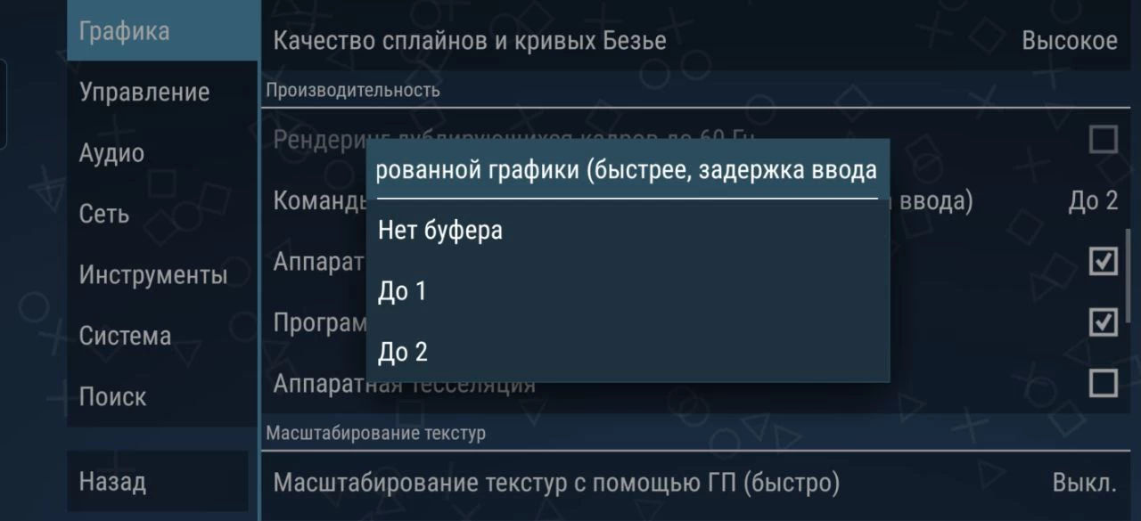 Ещё один способ избавиться от лагов — выставить «Команды буферированной графики» на «Нет буфера» или «До 1».