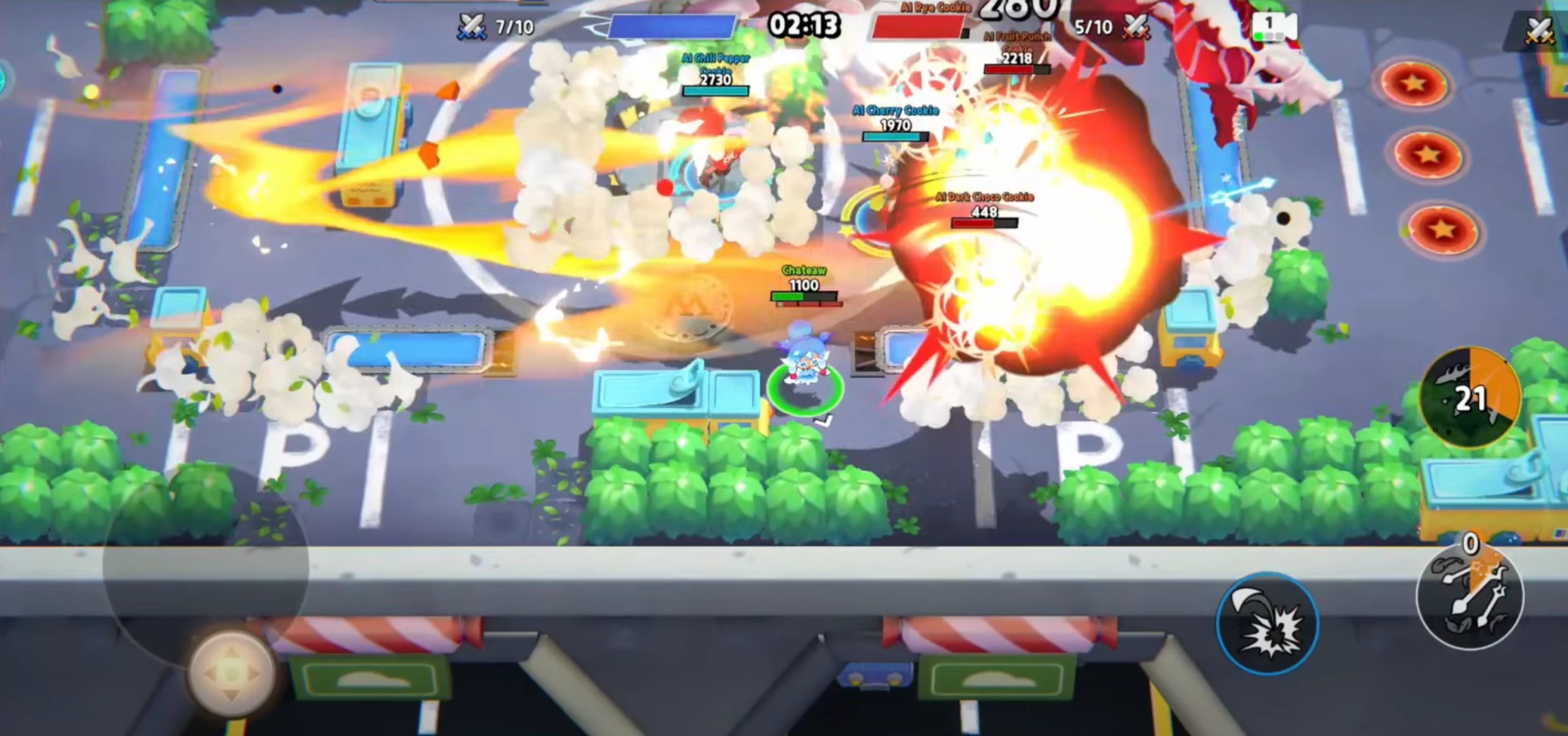 Далее вас ждёт обучение передвижению, стрельбе, использованию активных навыков и ультимейта. Сразу после этого вы попадёте в полноценный матч против ботов. Он проходит в формате 3v3 и длится 3 минуты. Ваша задача это уничтожить 10 соперников быстрее, чем это сделает вражеская команда. Для этого можно прятаться в кустах и совершать внезапные атаки, плюс подбирать карты посреди поля, которые спавнятся через определённое время. Стоит ожидать, что они выступают в роли модификаторов или дают вам временные усиления.