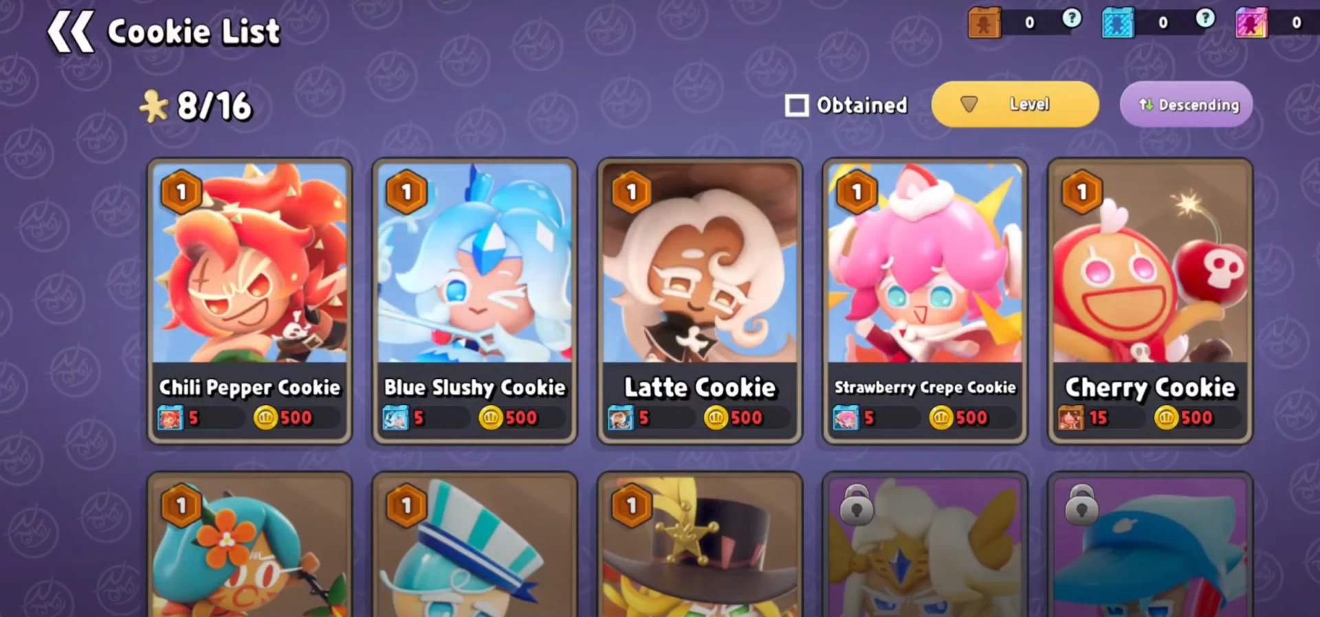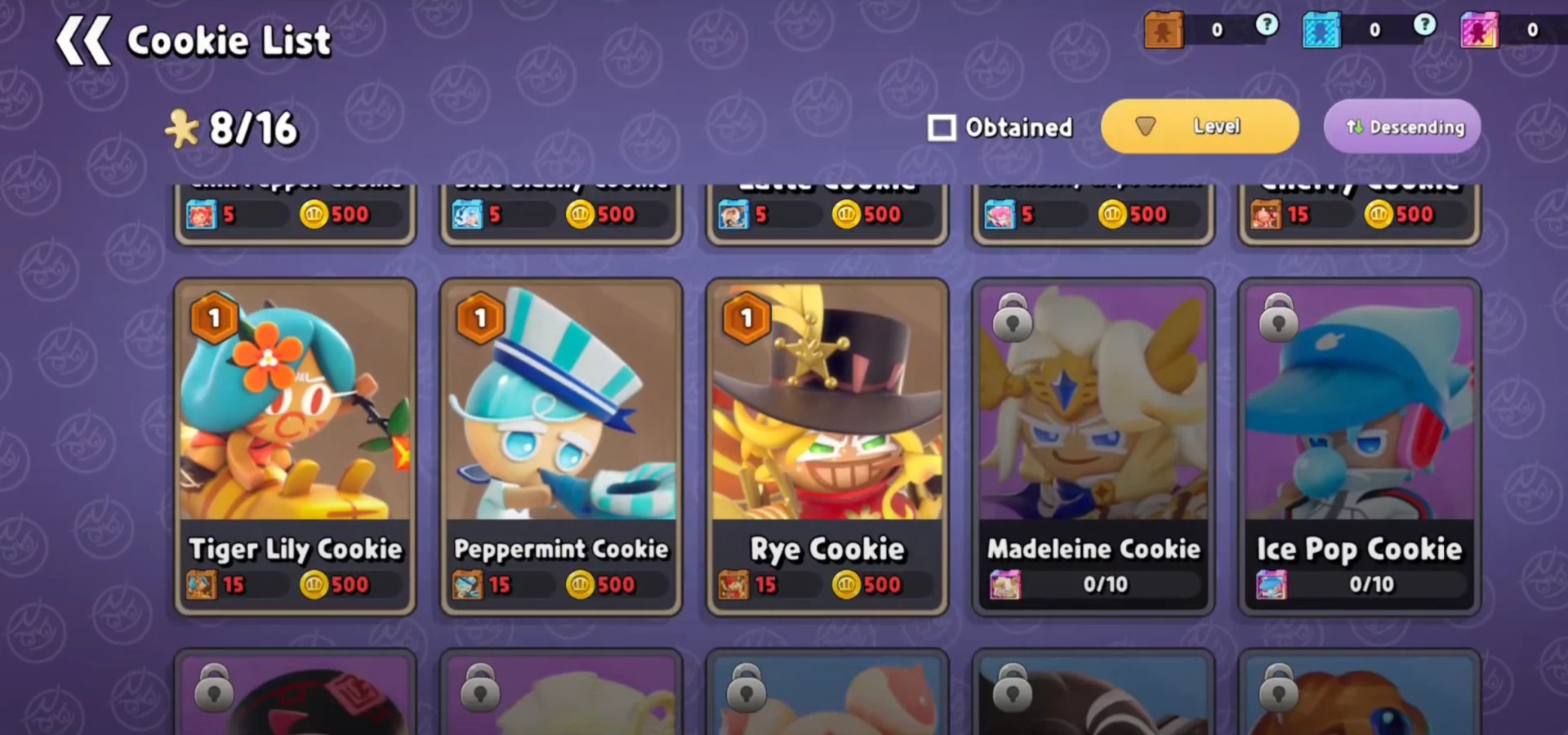 Теперь посмотрим на список доступных печенек — всего их 16 на ЗБТ. Каждого персонажа нужно отдельно прокачивать, а разблокировать их можно, если собрать 10 фрагментов.