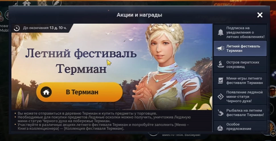 Ещё один ивент — «Летний фестиваль Термиан». Вы можете отправиться в деревню Термиан и купить предметы у торговцев. Необходимые для покупки Ледяные осколки можно получить, уничтожив Ледяную мини-статую Чёрного духа на побережье Термина.