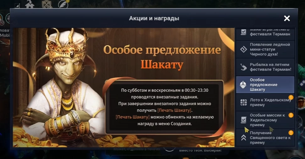 И последнее — на выходных случайным образом появляются внезапные задания. Если его завершить, вы получите «Печать Шакату». Её можно обменять на желаемую награду в меню Создания.
