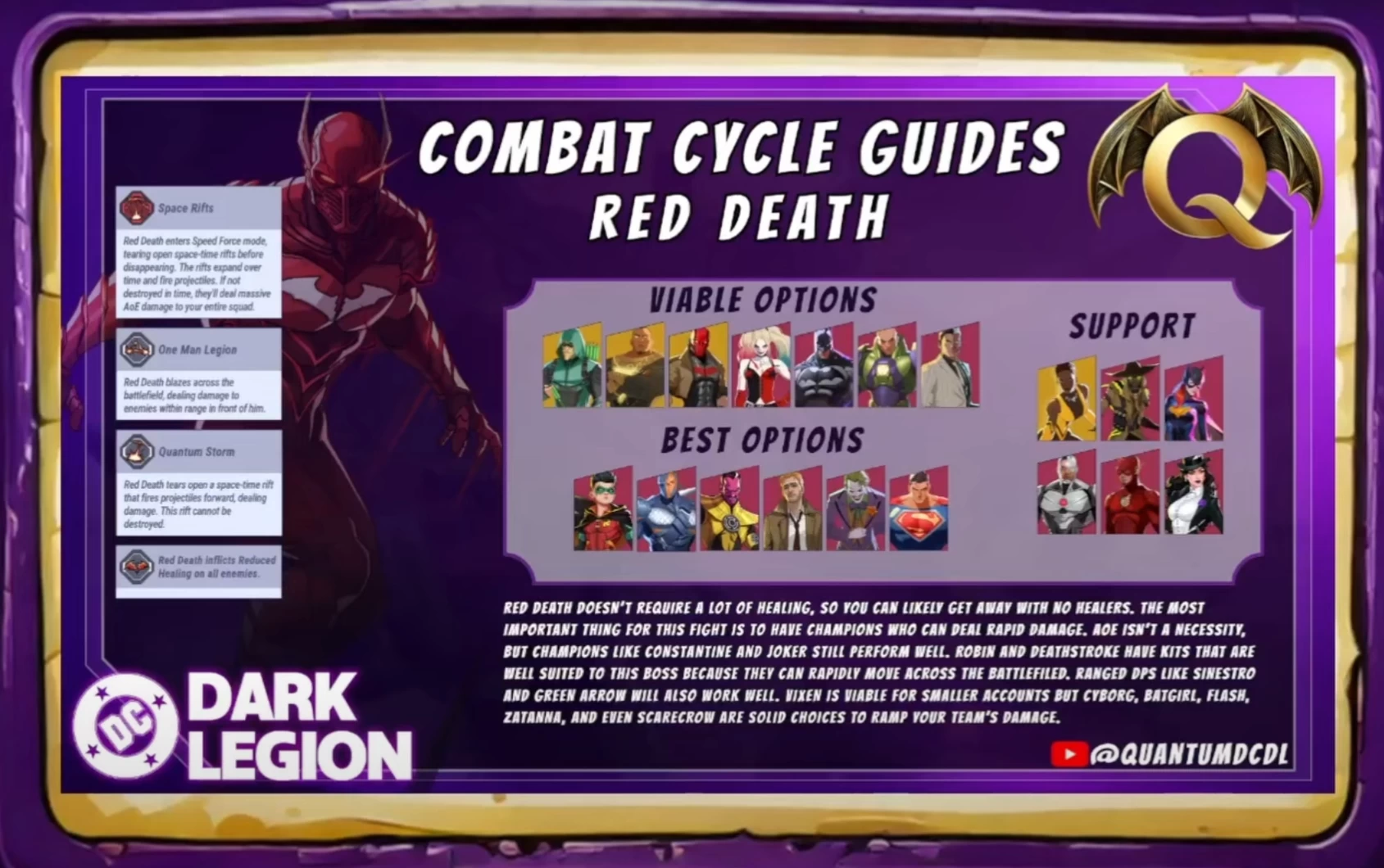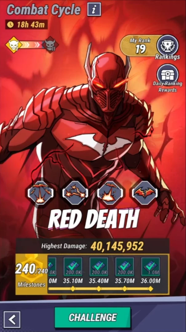 Red Death, он же «Красная Смерть» — ещё один Тёмный рыцарь армии Барбатоса и босс в режиме «Combat Cycle» в мобильной игре DC: Dark Legion. Первая способность, которую он использует, называется «Space Rifts» — босс призывает 4 разлома по краям экрана, которые стреляют по вашему отряду. Если их не уничтожить, то ваша команда получит огромный AoE-урон. Поэтому в ваш отряд нужно брать отличных DPS с уроном по одиночной цели — они должны как можно быстрее разобраться с разломами. В этот момент Красная Смерть исчезнет с поля боя и появится только после уничтожения разломов.