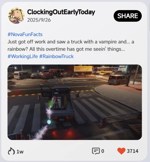 Текст на скриншоте: «Только закончил работать и увидел грузовик с вампиром и... радугой? Из-за сверхурочной работы у меня галюники.