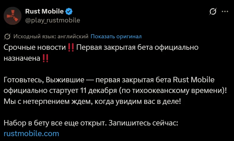 Поиграть в бета-версию англоязычной Rust Mobile можно будет уже в декабре. Так, на странице игры в X опубликовали пост, в котором говорится: «Первая закрытая бета официально стартует 11 декабря по тихоокеанскому времени».