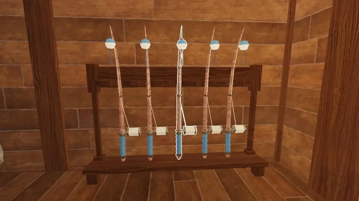 Внутри помещения вы найдёте несколько старых удочек. Возьмите любую и отправляйтесь к пруду, чтобы выловить свою первую рыбу. Когда вы возьмёте удочку, увидите отдельную шкалу опыта. Ловя рыбу, вы будете прокачивать опыт удочки. Если она засветится, значит шкала заполнена, и нужно идти к верстаку для бесплатного улучшения.