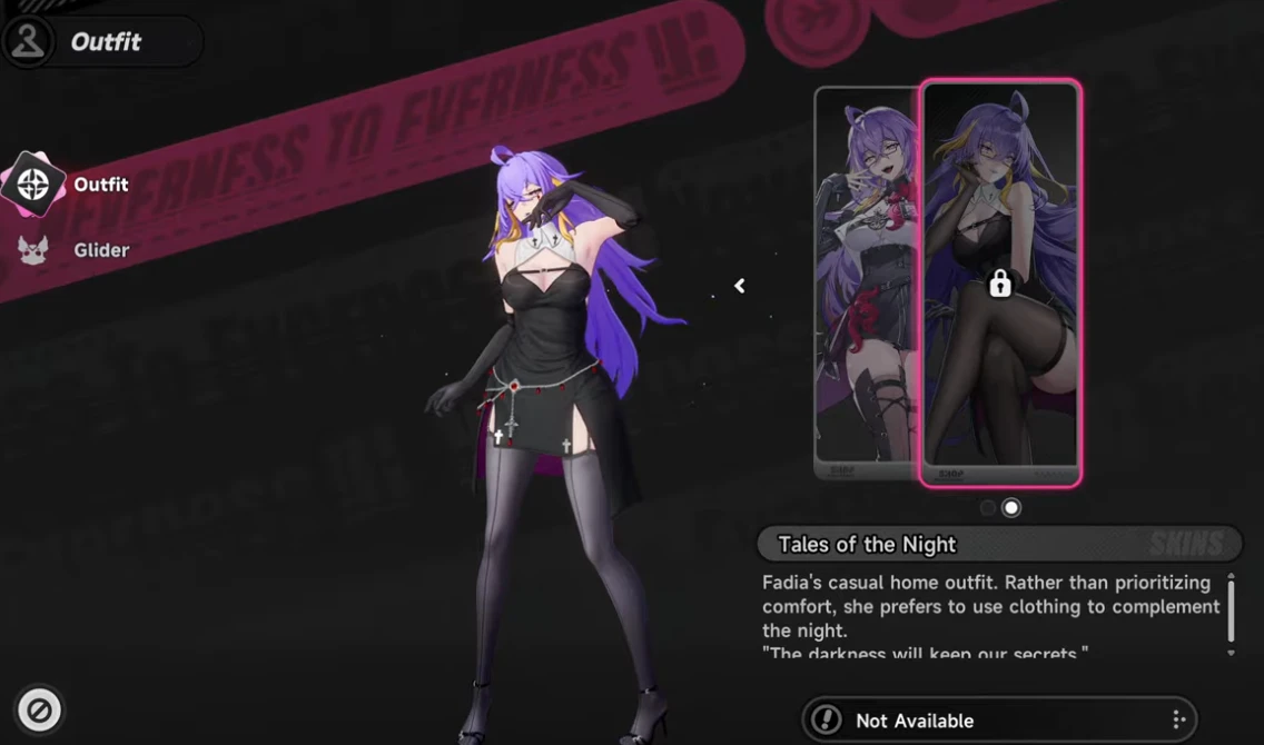 Эта чертовка так и манит игроков, первой предлагая им встречаться. Так что единственный наряд для неё, который показали в «бетке» — «Сказки на ночь». В описании сказано, что этот наряд она носит дома, приговаривая: «Тьма скроет наши тайны».