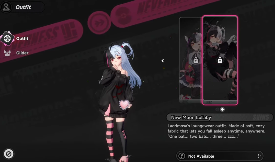 Этому персонажу выдали наряд «Колыбельная новолуния». Наряд выполнен из мягких и приятных на ощупь материалов, так что в нём очень легко уснуть — Лакримоза успевает досчитать только до трёх летучих мышей.