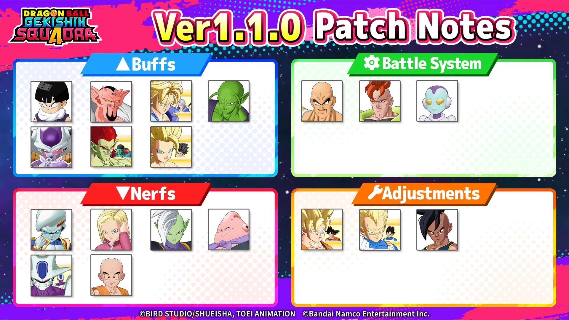 В Dragon Ball: Gekishin Squadra можно выделяться из толпы с помощью особых анимаций появления и «финишеров». На загрузку игрового клиента уйдёт минимум 1 ГБ, а англоязычные игроки столкнулись с техработами на серверах. Более того, разработчики уже выпустили первый патч 1.1.0, в котором они изменили баланс некоторых персонажей.