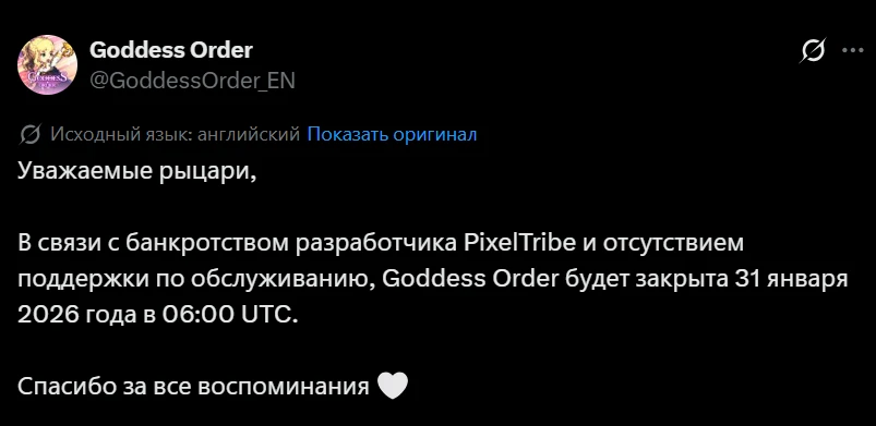 В официальном обращении к игрокам от 23 декабря 2025 года говорится о том, что сервера Goddess Order закроют 31 января 2026 года. Игроков и фанатов проекта поблагодарили за поддержку и любовь. Начиная с 31 января все данные будут удалены, а игру уберут из App Store и Google Play. В этот же день удалят страницы в соцсетях.