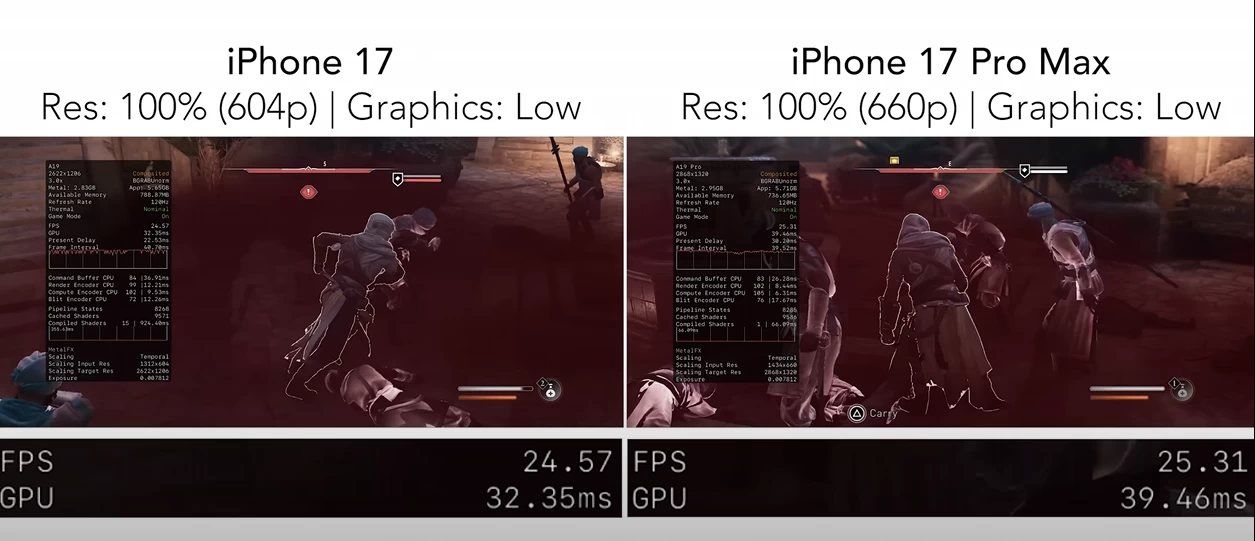 iPhone 17 не сильно отстаёт от своего прокачанного 17 Pro Max, но в загруженных сценах чип A19 Pro «вывозит» 25-30 FPS.