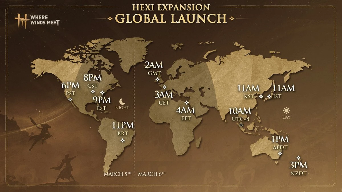 В прошлой новости я рассказал, что новый регион Хэси в Where Winds Meet выйдет 6 марта. Теперь разработчики опубликовали карту со странами, обозначив точное время выхода обновления для разных часовых поясов. К сожалению, UTC+3 решили обойти стороной, поэтому наша редакция взяла это дело в свои руки — обновление станет доступно в 5 утра по мск.