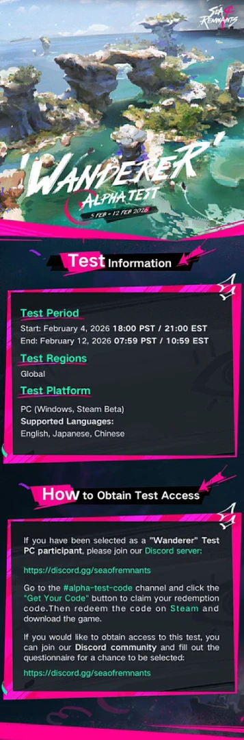 Тестировать будут глобальную версию Sea of Remnants, но только на PC (Windows через Steam Beta). Из поддерживаемых языков — английский, японский и китайский.