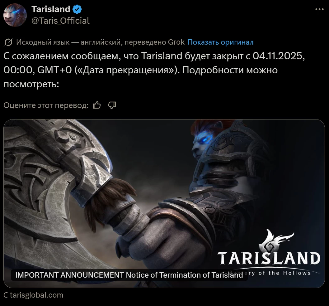 4 сентября на официальном сайте Tarisland опубликовали пост, в котором разработчики сообщили о скором закрытии игры. Это касается глобальной версии на iOS, Android и PC. Сервера закроют 4 ноября 2025 года в 3 ночи по мск. До этого времени вы можете продолжать играть и использовать внутриигровые предметы.