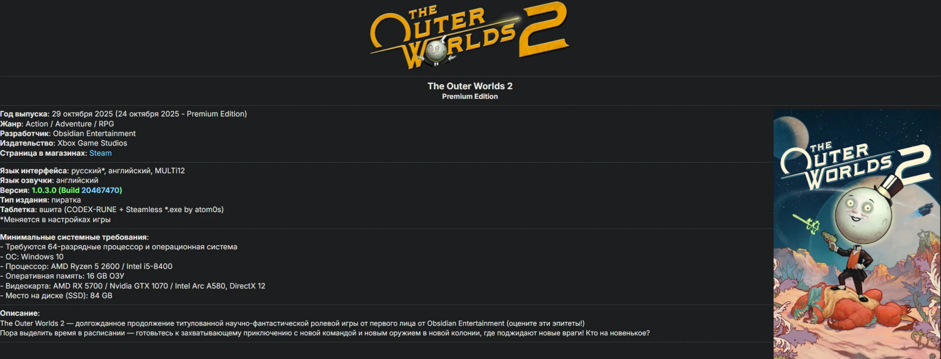 Сегодня, 24 октября, игра The Outer Worlds 2 от Obsidian Entertainment вышла в ранний доступ. Официально поиграть могут только те, кто купил премиум-издание. Остальным бы пришлось ждать 29-го октября. Энтузиасты воспользовались этим, чтобы слить релизную версию раньше времени на знаменитых в Рунете файлообменниках. Из озвучки есть только английский, а интерфейс и субтитры — на русском. Минимально для игры требуется 16 ГБ ОЗУ, процессор на уровне AMD Ryzen 5 2600 или Intel i5-8400, а также видеокарта уровня AMD RX 5700, Nvidia GTX 1070 или Intel Arc A580; главное, чтобы была поддержка DirectX 12. На SSD игра займёт 84 ГБ.