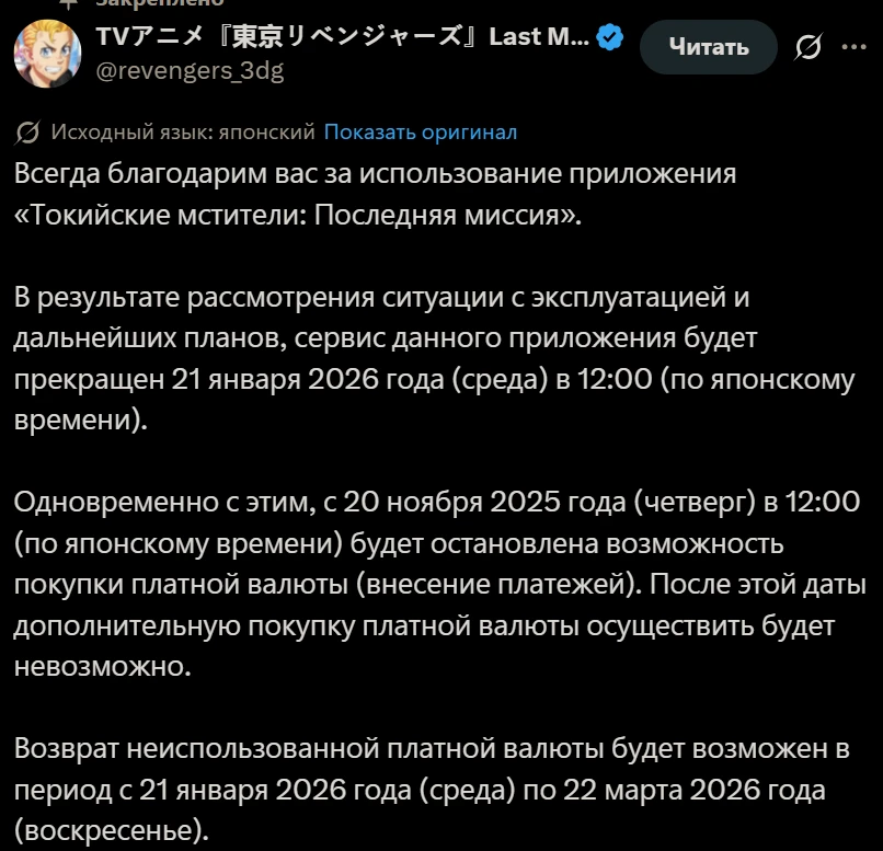 Tokyo Revengers Last Mission вышла в 2024 году на смартфонах и PC. С тех пор некоторые читатели AppTime надеялись на глобальную версию. К сожалению, этим планам не суждено сбыться — сегодня, 20 ноября, разработчики опубликовали пост в X. В нём они сообщили о скором закрытии проекта. Так, с этого дня отключены внутриигровые покупки. Игровые сервера отключат 21 января 2026 года. До этого времени можно подать заявку на возврат денег за неиспользованную платную валюту.