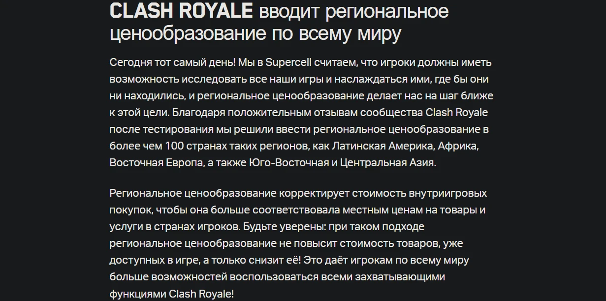 12 ноября разработчики Clash Royale из Supercell опубликовали пост на официальном сайте. В нём они рассказали, что игроки по всему миру должны иметь возможность наслаждаться играми компании. И для этого они вводят региональные цены более чем в 100 странах Латинской Америки, Африки, Восточной Европы, Юго-Восточной и Центральной Азии.
