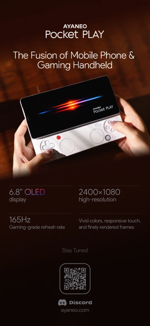 В AYANEO Pocket PLAY поставят OLED-дисплей с диагональю 6,8 дюймов, частотой 165 Гц и разрешением 2400x1800.