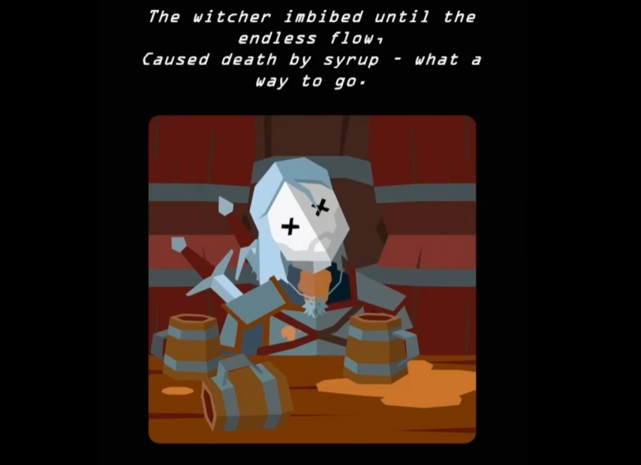 Также у Геральта будут разные смерти, сопровождающиеся уникальными артами. Например, ведьмак может умереть от большого количества сиропа.
