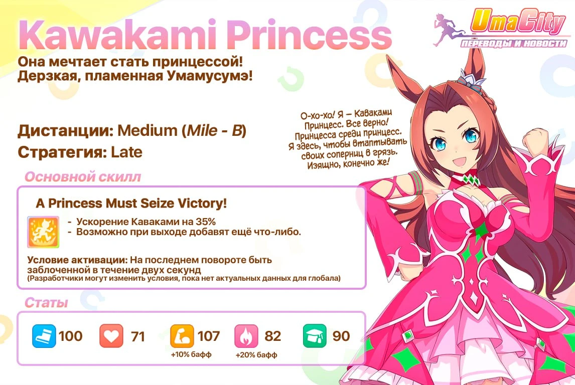 В мобильную игру Umamusume: Pretty Derby добавят 3-звёздочного персонажа, Каваками Принцесс. Она появится вместе с обновлением, которое намечено на завтра, 2 декабря в 1 час ночи по мск. Данная пони ранее фигурировала в игре в рамках ивента про платья. Её основной навык «Принцесса должна победить!» ускоряет Каваками на 35%, но для этого её должны «заблокировать» в течение 2 секунд на последнем повороте.
