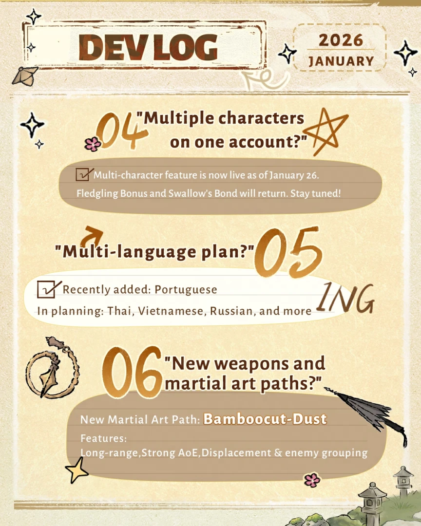 - Новую секту боевых искусств Bamboocut-Dust с боями на дальней дистанции и упором на AoE.