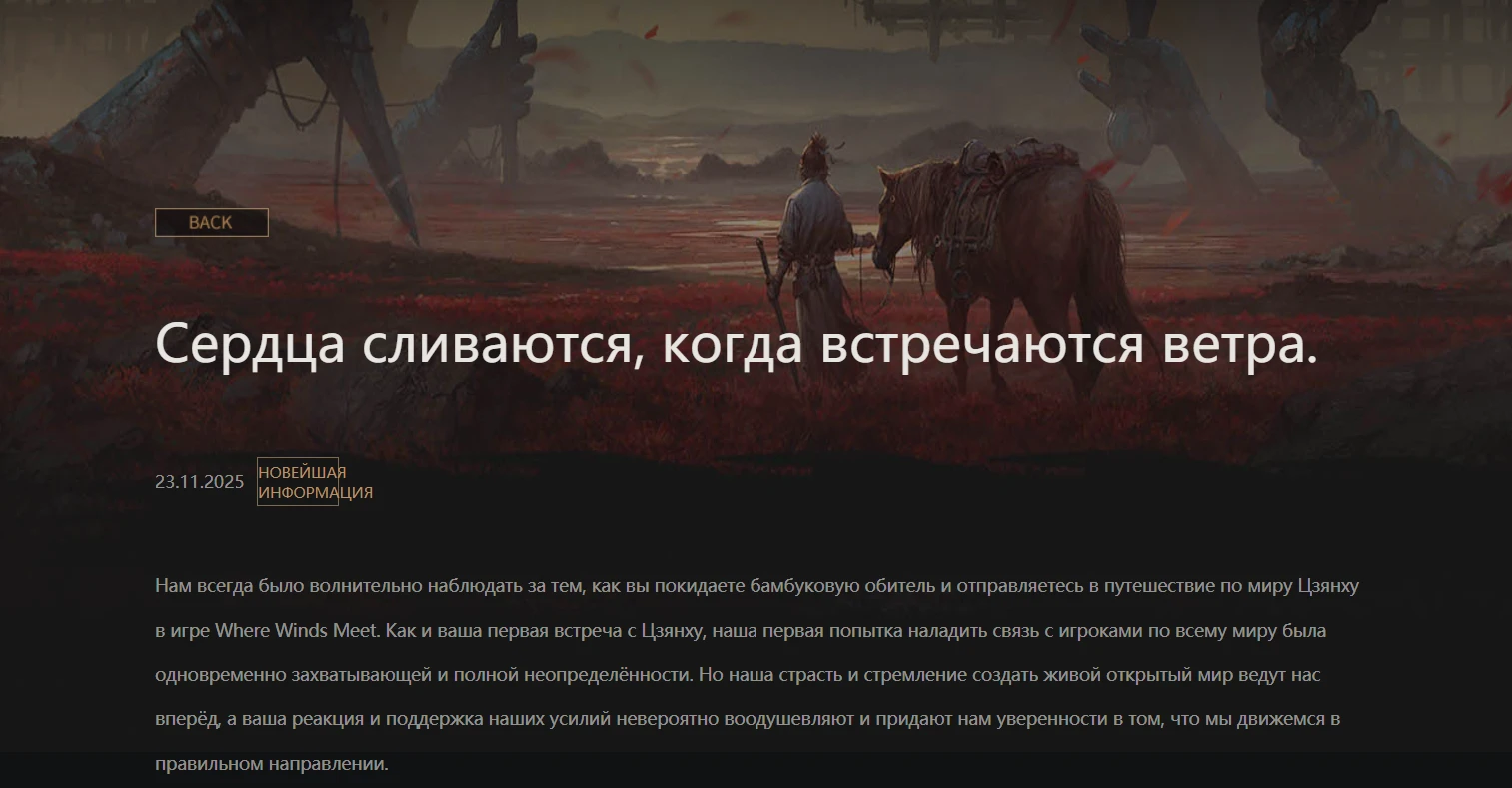 23 ноября разработчики Where Winds Meet опубликовали пост, в котором рассказали о планах на ближайшее будущее. Так, они уже исправили ошибку, связанную с высоким пингом в мультиплеерном режиме — раньше игроки из Европы, Ближнего Востока и ряда других регионов автоматически подключались не к локальным серверам, что и было причиной проблемы. Решение с задержкой в одиночной кампании выйдет в середине декабря.