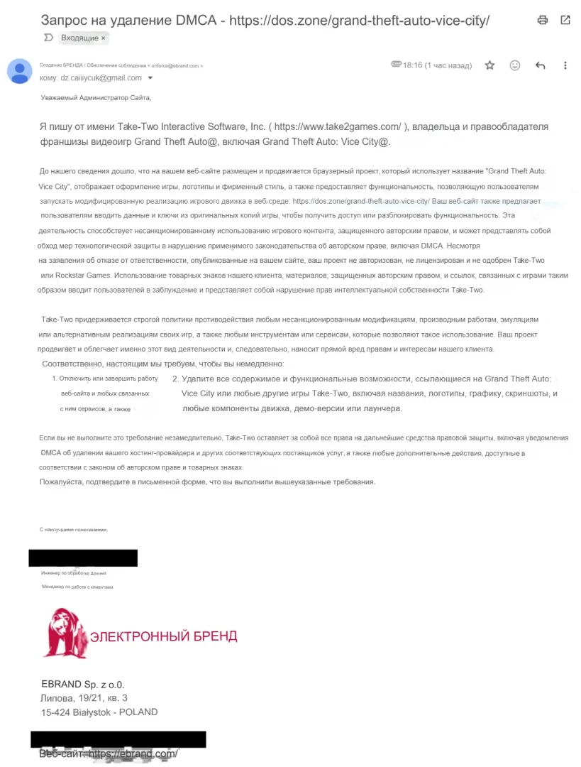 Теперь держатели сайта, через который можно было поиграть в Vice City, опубликовали электронное письмо от представителя Take-Two и Rockstar Games. В нём говорится, что использовать ассеты игры без разрешения правообладателя нельзя. В веб-версии также нельзя было пройти кампанию без предоставления файлов оригинальной Vice City. В Take-Two посчитали, что это тоже нарушает их права.