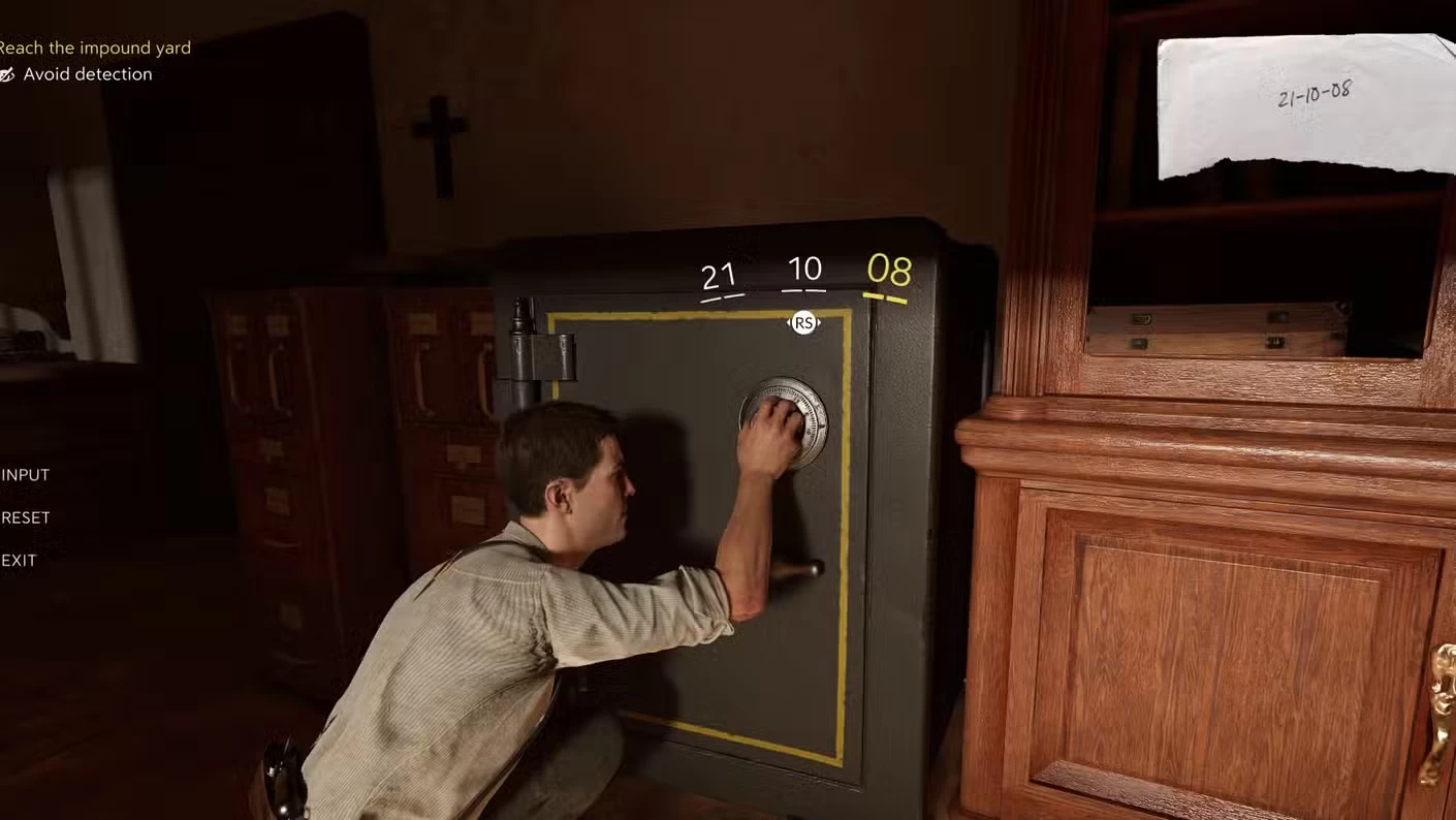 Далее открываем сейф на штрафстоянке в 3-й главе. Найти комбинацию от него можно в офисе слева. Вы найдёте документ на комоде в дальнем левом углу кабинета. В нём указан код — 21-10-08. Внутри будет 200 динар.