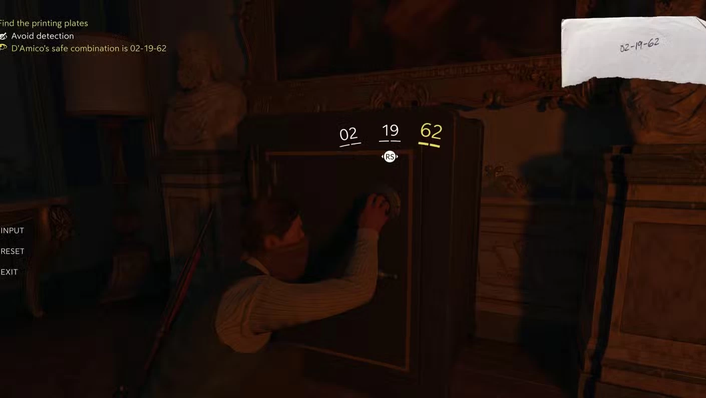 Последним открываем сейф Д'Амико в 6-й главе. На ближайшем столе лежит документ с комбинацией 02-19-62. Внутри вас ждёт квестовый предмет, который нужен для продвижения по основному сюжету — печатные формы Джузеппе.