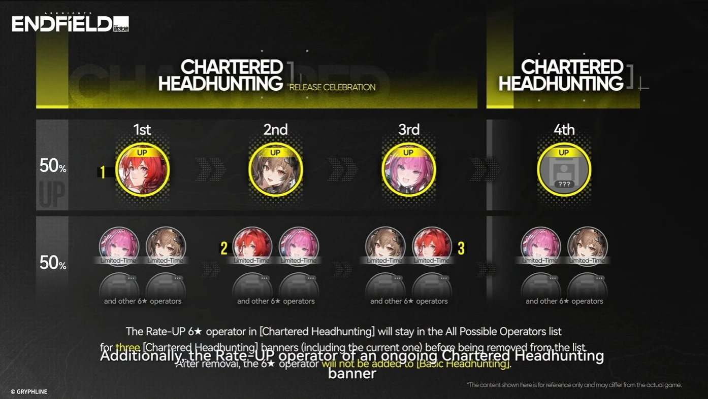 Первые 3 персонажа из баннеров с повышенным шансом выпадения — Laevatain, Gilberta и Yvonne. Ротация баннеров будет проходить каждые 2,5 недели. Система гаранта срабатывает после 120 неудачных круток. Также будут отдельные баннеры на оружие с гарантированной 6-звёздочной пушкой после 40 круток.
