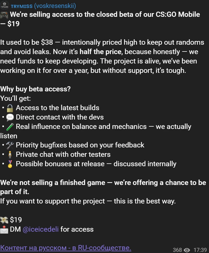 Те, кто потратит $19, получат доступ к последним билдам CS:GO Mobile, смогут общаться напрямую с разработчиками, иметь реальное влияние на баланс и механики, общаться с другими тестировщиками и получить возможные бонусы на релизе. При этом энтузиасты отмечают, что они не продают законченный продукт — игра ещё далека от завершения.