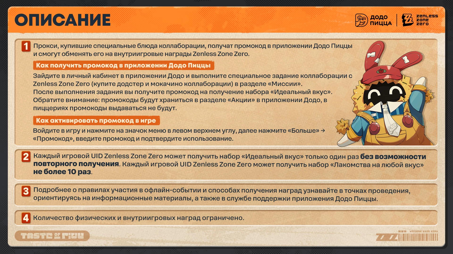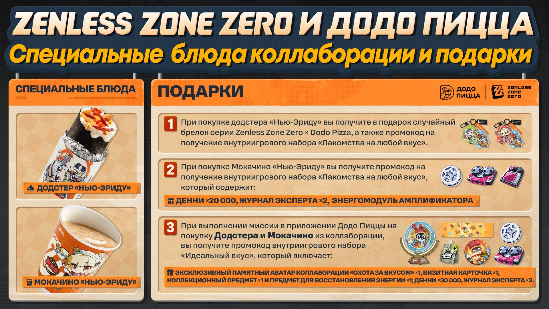 «Охоту за вкусом» называют самым масштабным офлайн-событием ZZZ, которое когда-либо проводилось в России и Беларуси. В рекламных материалах сверкают персонажи Энби и Бёрнис, а в меню появятся две специальные позиции: Додстер «Нью-Эриду» и Мокачино «Нью-Эриду». За их покупку игроки получат промокод в приложении Додо Пиццы на получение внутриигровых наград, включая эксклюзивный памятный аватар события, визитную карточку и мерч серии «Охота за вкусом».